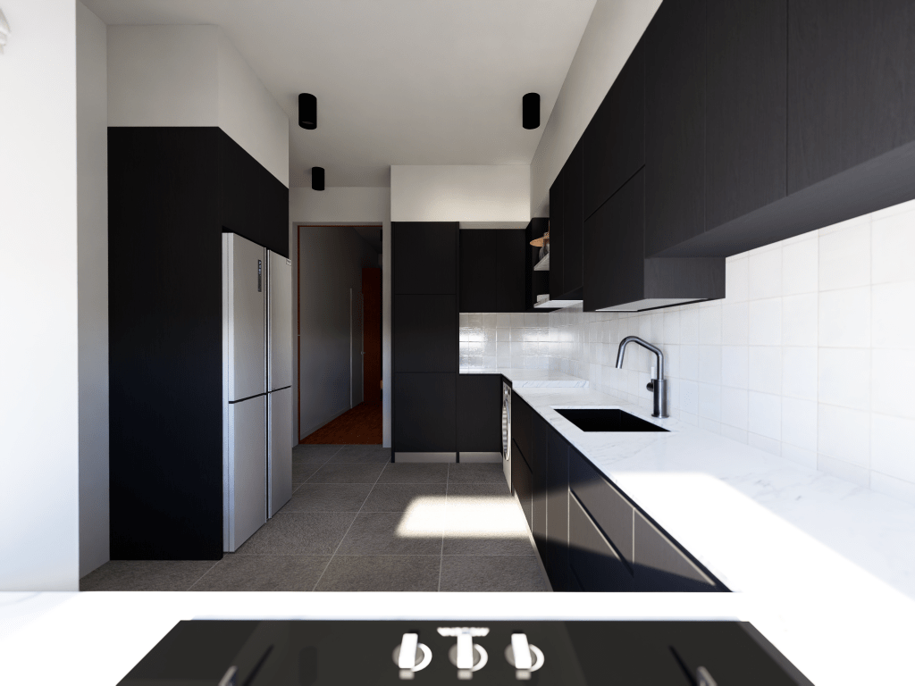 The kitchen delivers streamlined function with gallery-worthy elegance. Black matte cabinetry blends seamlessly with clean white quartz countertops, offering a refined backdrop for daily rituals.